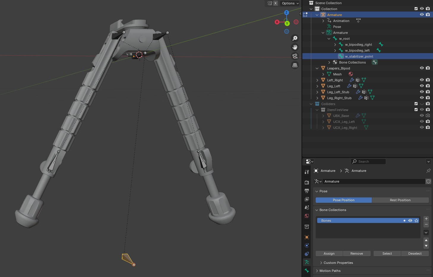 Creating a bipod is really no different then how you normally would on the weapon the only exception is you need to have a specific bone / memory point called w_stabilizer_point. Without this bone the system will not function, it is used for setting the offset height to apply to the stabilization bone on the weapon. Generally you want it to be positioned just slightly below the feet of the bipod. Refer to the included bipods bone/skeleton structure. I recommend to make it a bone as I may change it around in the future where the deployed state will be based on position of w_stabilizer_point.
