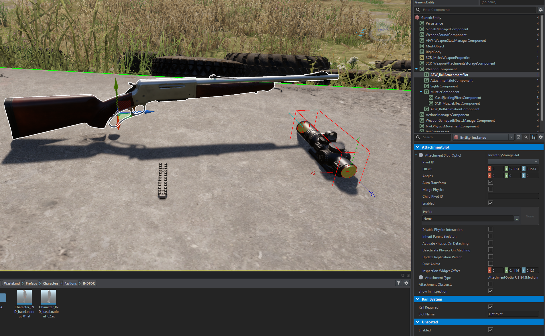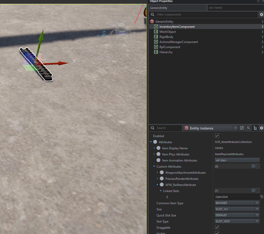 First you'll need to create your equipable "rail", you can look at the VZ stock or M16 handguard rail to see how to create gun parts, to make them equipable you need to assign a unique attachment type to them and make sure InventoryItemComponent is enabled. Once you have your item created add the custom attribute AFW_RailItemAttribute to custom attributes under the InventoryItemComponent. You'll be presented with a list, add an entry and name the slot you want to link it to, for this example we only have 1 slot which will be used for optics so we'll call it OpticSlot.