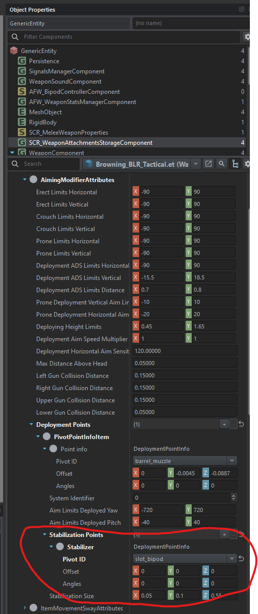 First add the component AFW_BipodControllerComponent to your weapon. Afterwards go to the SCR_WeaponAttachmentsStorageComponent and under Custom Attributes->AimingModifierAttributes->DeploymentPoints set a stabilization point. Set the target bone/memory point as the Pivot ID.